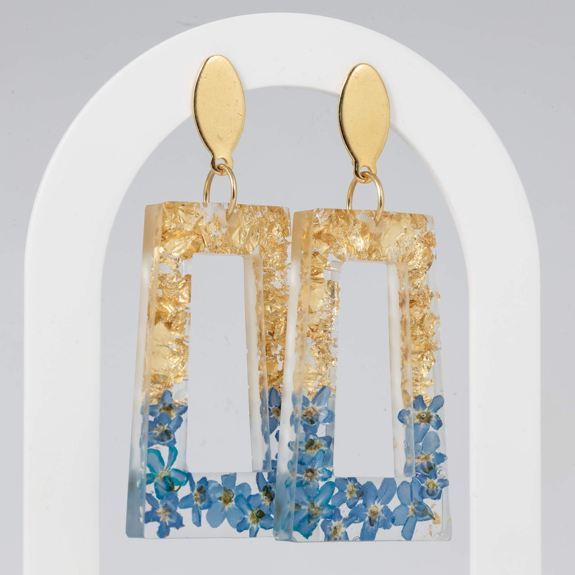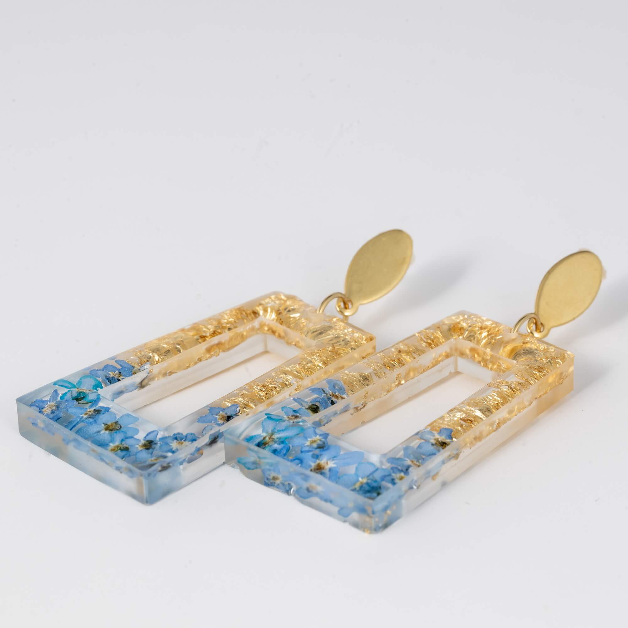 Materiale folosite: flori naturale presate de nu-ma-uita, rasina ecologica si elemente metalice din otel inoxidabil auriu hipoalergenic, foita de aur.