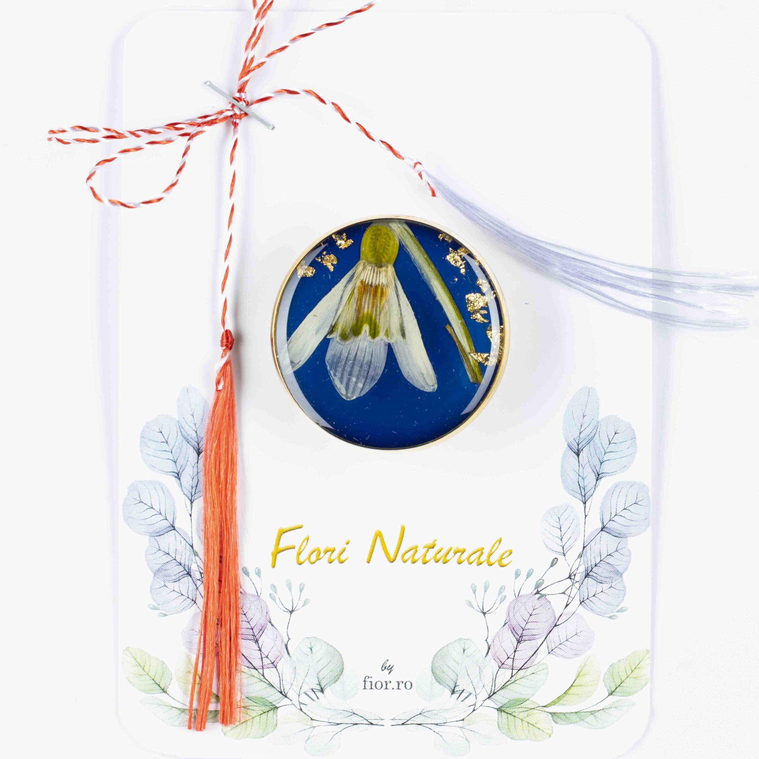 • Materiale: Bază broșă din oțel inoxidabil auriu, floare naturală presată de Ghiocel și rășină specială pentru bijuterii.